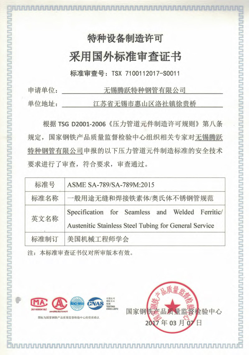特種設(shè)備制造許可證采用國(guó)外標(biāo)準(zhǔn)審查證書