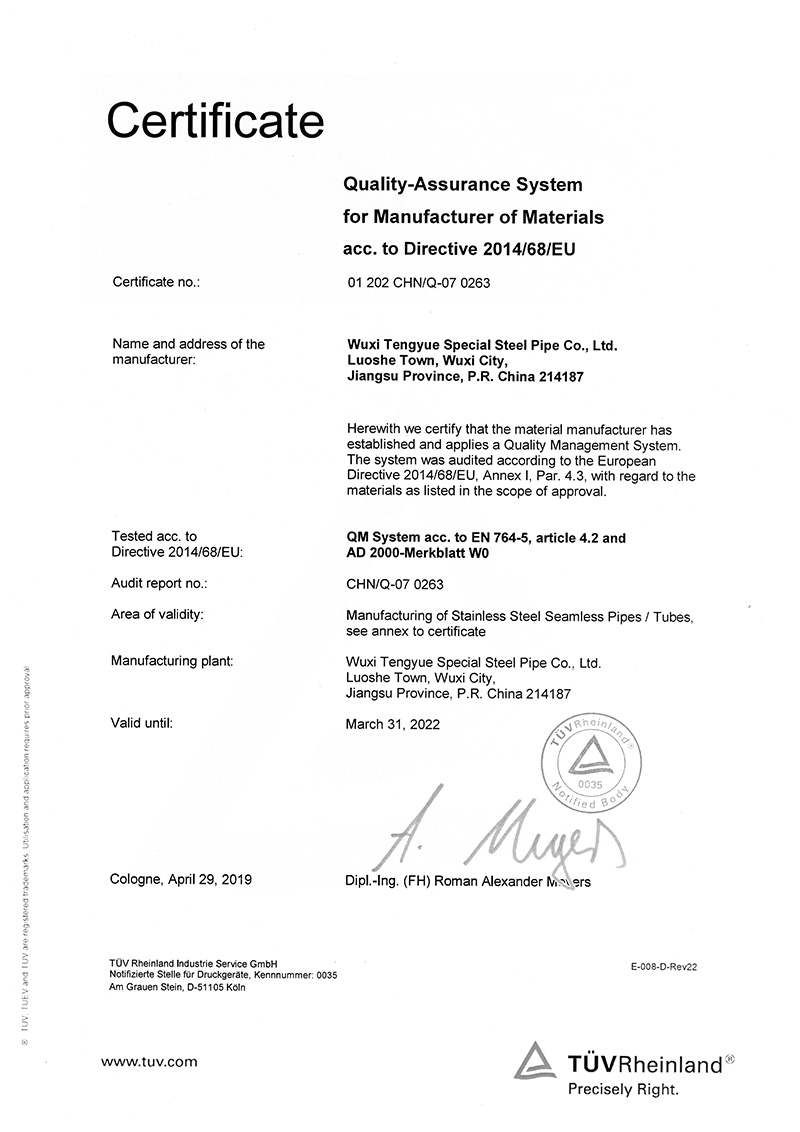無錫騰躍特種鋼管有限公司創(chuàng)建于1987年,地處江蘇省無錫市惠山區(qū)洛社鎮(zhèn)。公司占地面積18萬平方米,現(xiàn)有員工350人,是一家專業(yè)生產(chǎn)不銹鋼無縫管的企業(yè),年產(chǎn)能5萬噸。主要規(guī)格:外徑6~630mm、壁厚0.7~40mm。主要材質(zhì):奧氏體、奧氏體-鐵素體、鎳基合金等。 公司是中石化、中石油、中海油、核電的供應(yīng)商網(wǎng)絡(luò)成員單位,是江蘇省AAA級信用單位。公司先后通過ISO9001質(zhì)量管理體...